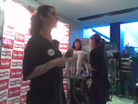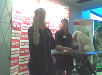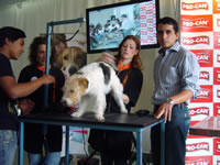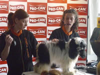 La Maestra Gómez realizando un corte comercial a un caniche, y explicando los ultimos estilos de moda que se realizan en España.