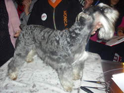 EL SIGUIENTE FUE EL SNAUZHER LLAMADO DOKY, UN EJEMPLAR ESTRUCTURALMENTE MUY BUENO, PODEMOS APRECIAR EL CORTE QUE LAS MAESTRAS LO REALIZAN MIENTRAS QUE LOS ASISTENTES OBSERVAN Y APRENDEN.
