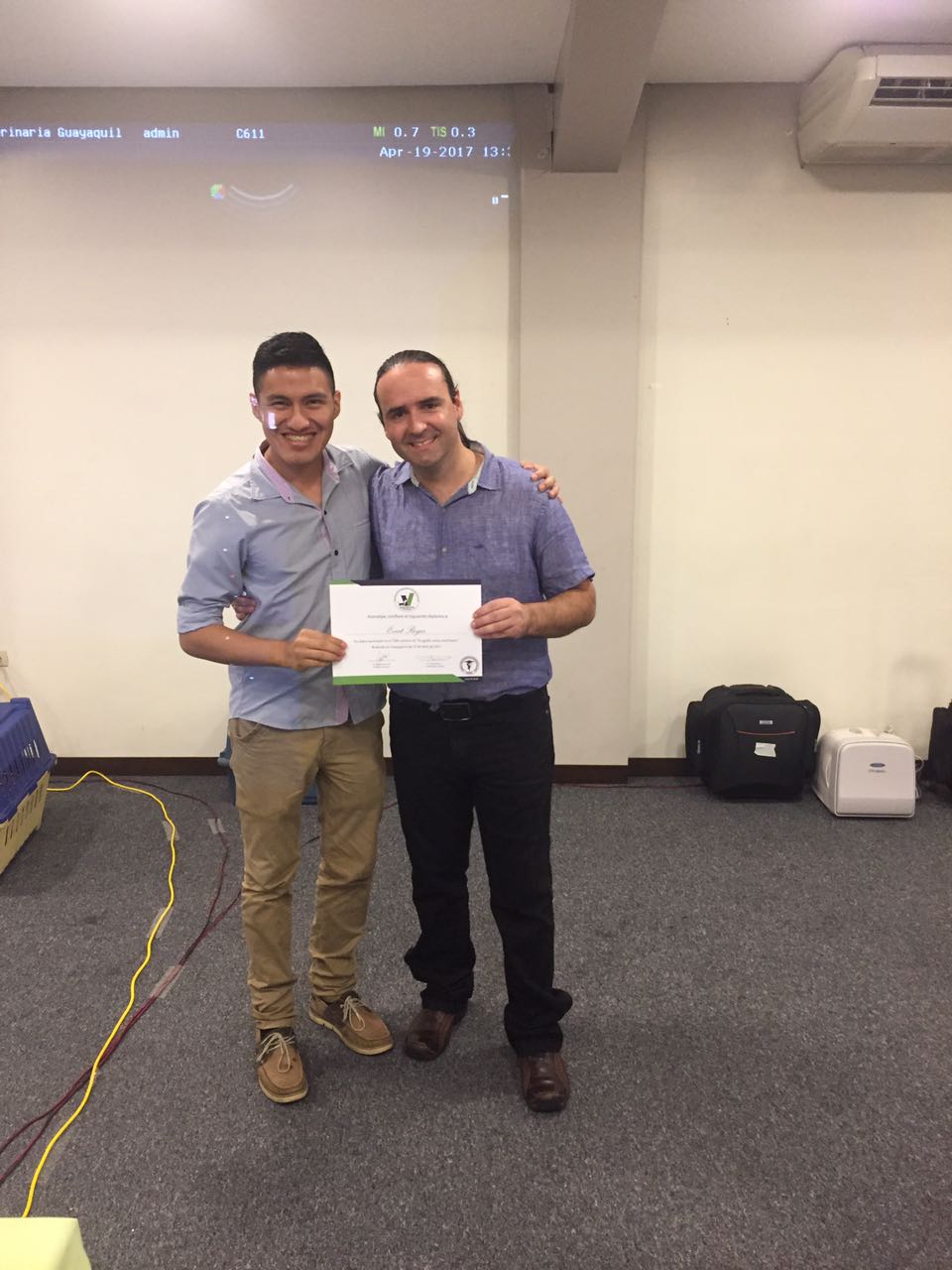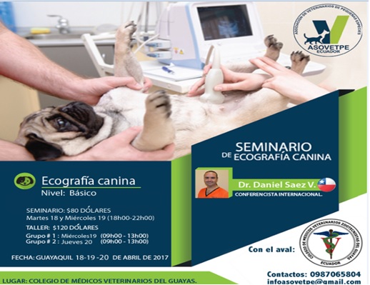 El Seminario y taller de ecografía canina , fue realizado del 18 al 20 de abril del 2017, en el Colegio de Veterinarios del Guayas, con el aval de ASOVETPE-ECUADOR, conferencia dictada con el especialista chileno Dr. Daniel Saez V.