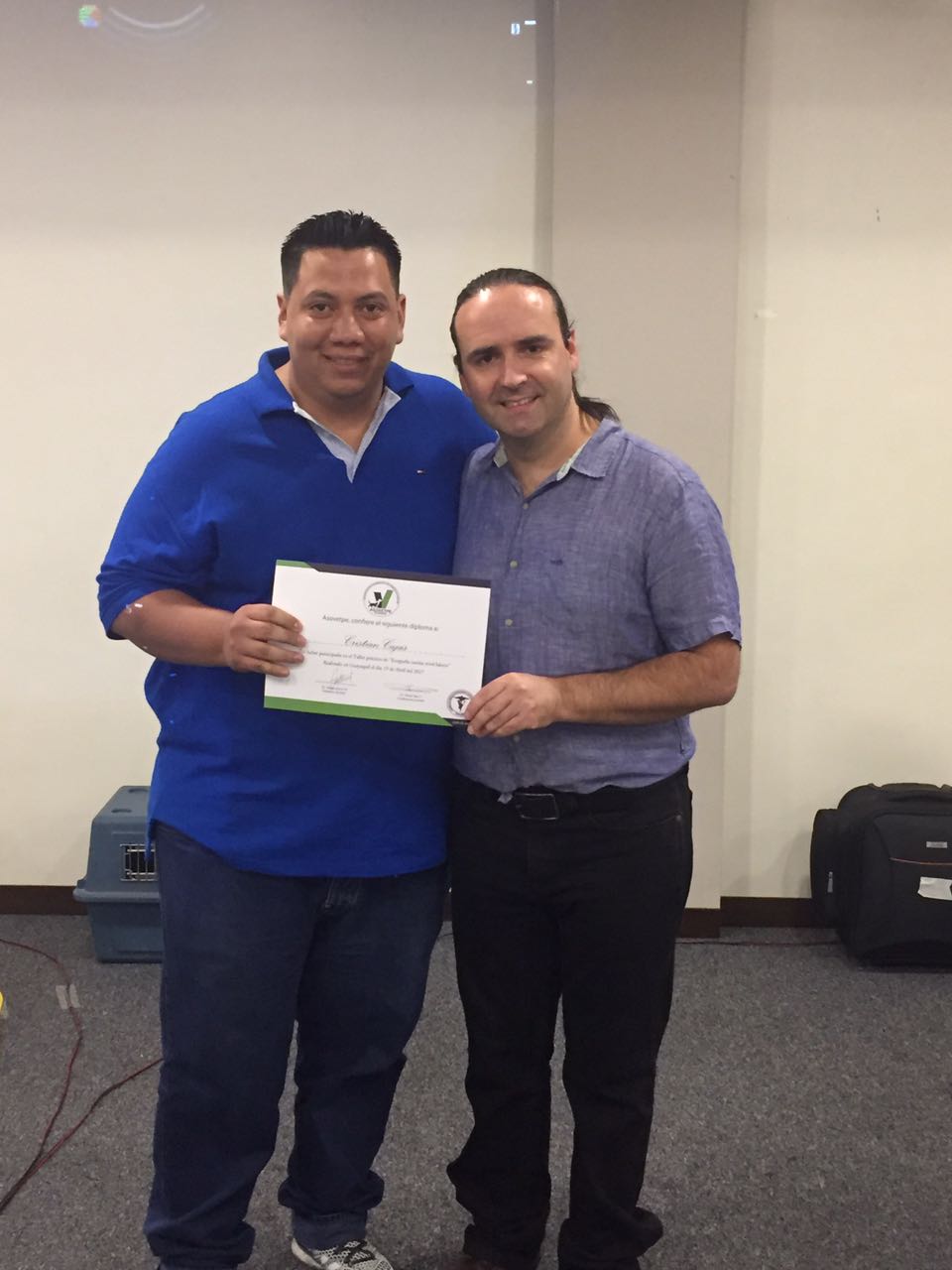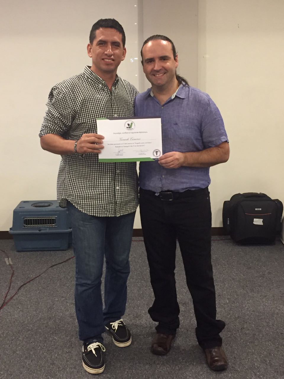 Sr. Christian Cajas recibiendo el certificado por haber participado en el Seminario-Taller de Ecografía canina junto al Dr Daniel Saez.